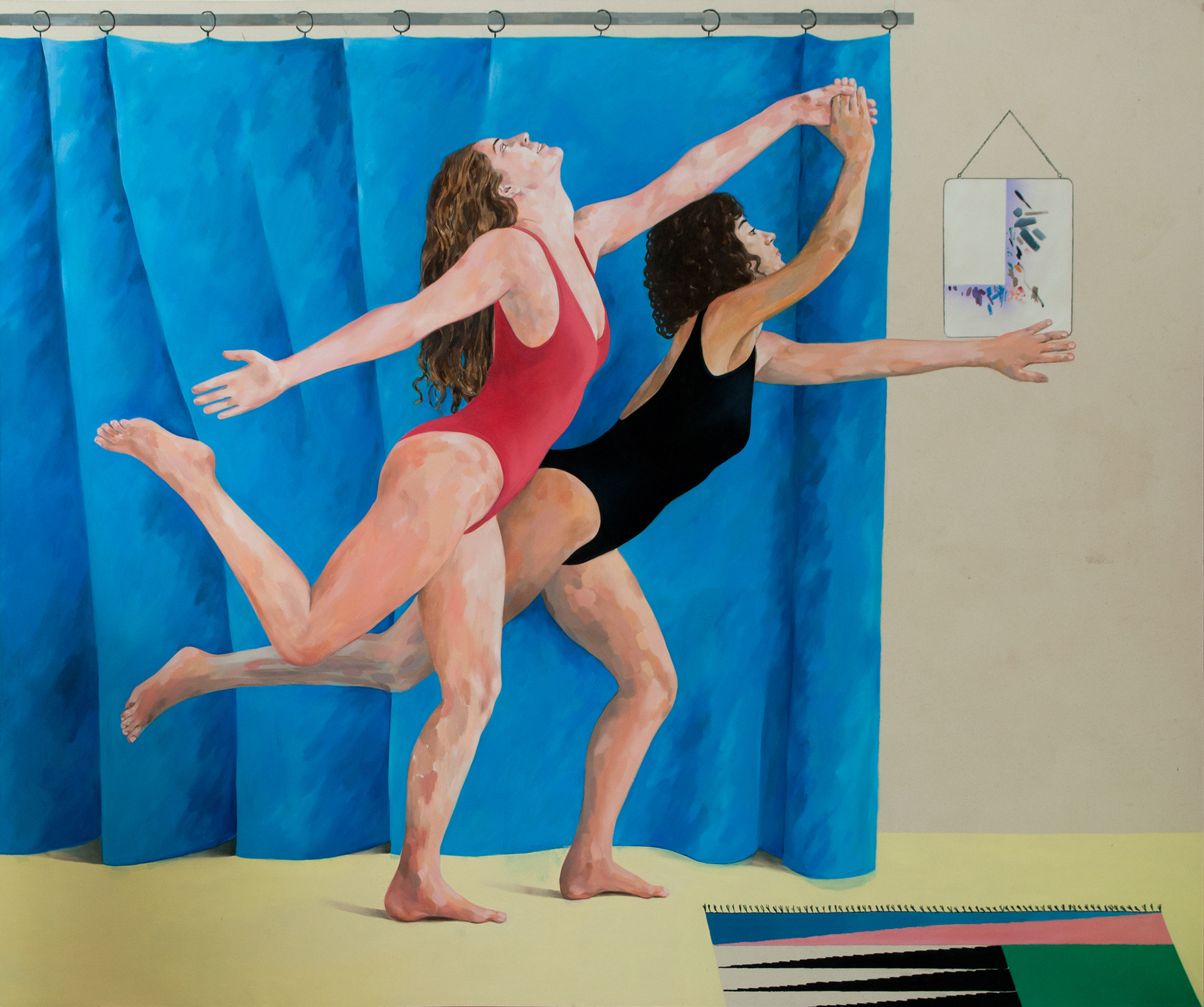 J’ai fait venir deux modèles (et artistes) Jehane Mahmoud et Cécilia Granara à l’atelier avec l’intention de les faire poser en maillot de bain : j’avais envie de peindre de la chair, des jambes et des bras nus et de faire interagir ces corps dans des postures sculpturales mais joyeuses et épanouies. Elles ont essayé de nombreuses poses mais celle qui s’est imposée était la reprise quasi parfaite de la peinture de Picasso. Ce qui m’intéressait particulièrement c’était les positions des mains : deux sont entrelacées et deux se découpent dans leur forme la plus simple sur une surface bleue. J’ai choisi de les déplacer dans un espace intérieur mi-atelier, mi-théâtre comme pour révéler la mise en scène et aussi parce que l’espace de l’atelier m’intéresse. C’est l’endroit où je passe le plus de temps. On y voit des choses qui sont banales pour les artistes comme par exemple les traces de peintures dans le miroir mais elles peuvent prendre une autre dimension pour celui ou celle qui n’est pas habitué·e à ces espaces. J’aime figurer le processus de création, le lieu où il arrive et les traces qu’il laisse. Cela m’intéresse aussi beaucoup au cinéma dans des films comme La Nuit Américaine, Singin’ in the rain, Inland Empire...